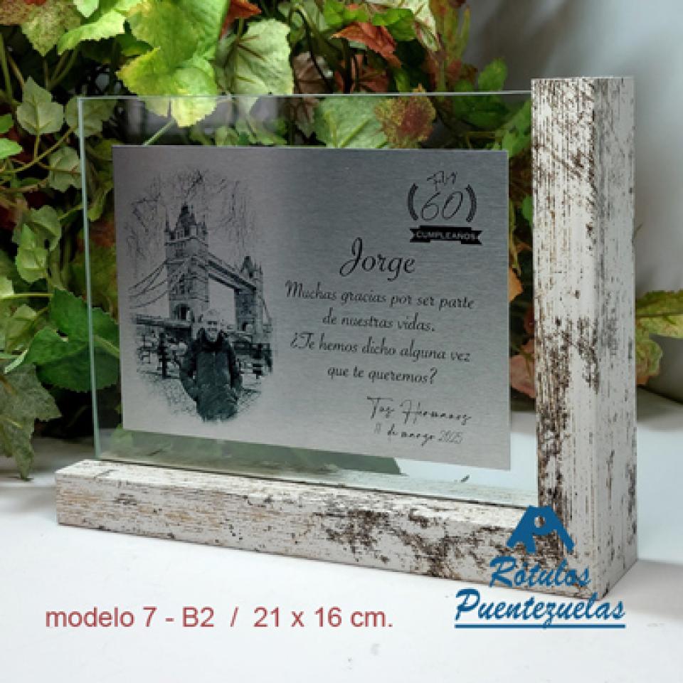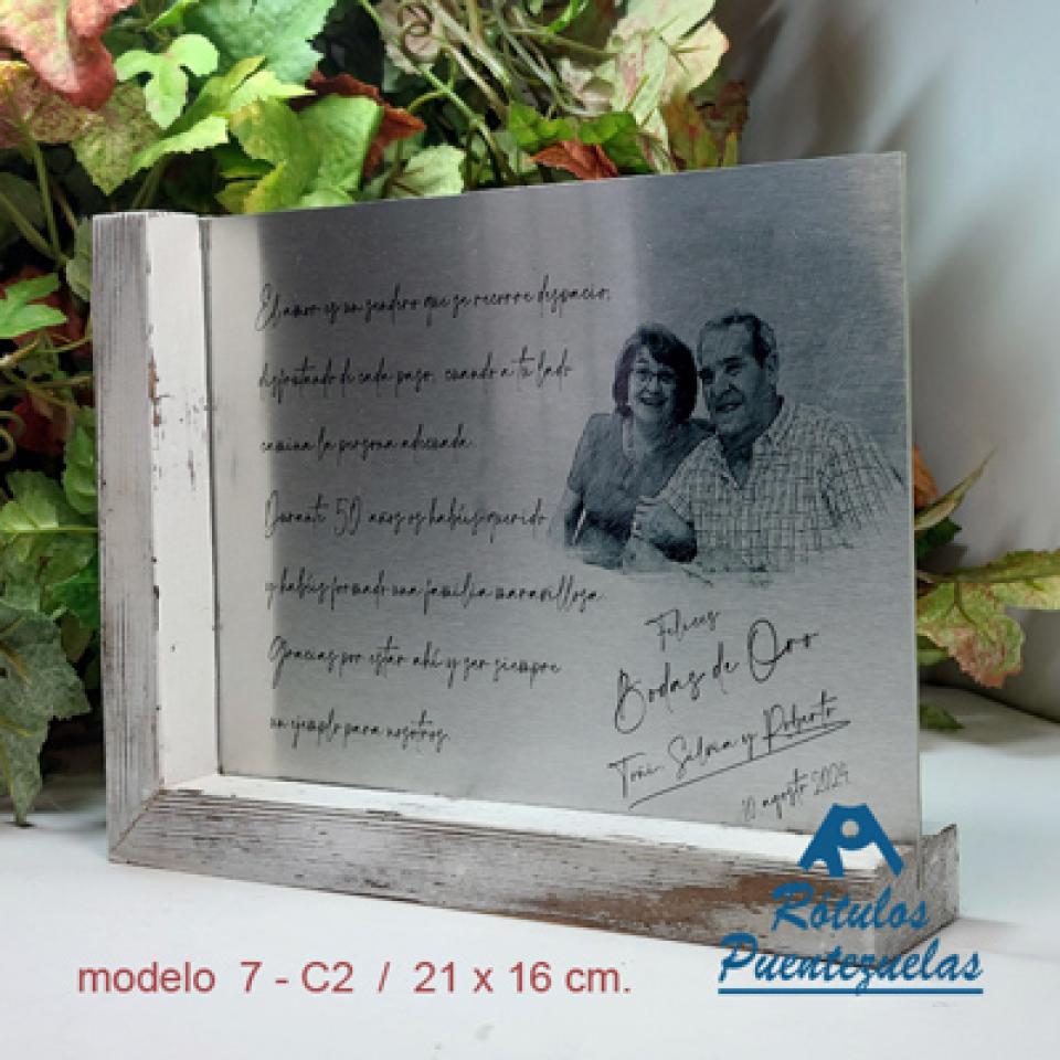 Placa de homenaje de sobremesa IMPRESA en aluminio plateado cepillado satinado (mate), confeccionada con impresión, placa con forma recta, texto negro o en el color según el diseño, se incluye en el precio expuesto la IMPRESIÓN convenida y el ESTUCHE ESTÁNDAR de presentación.