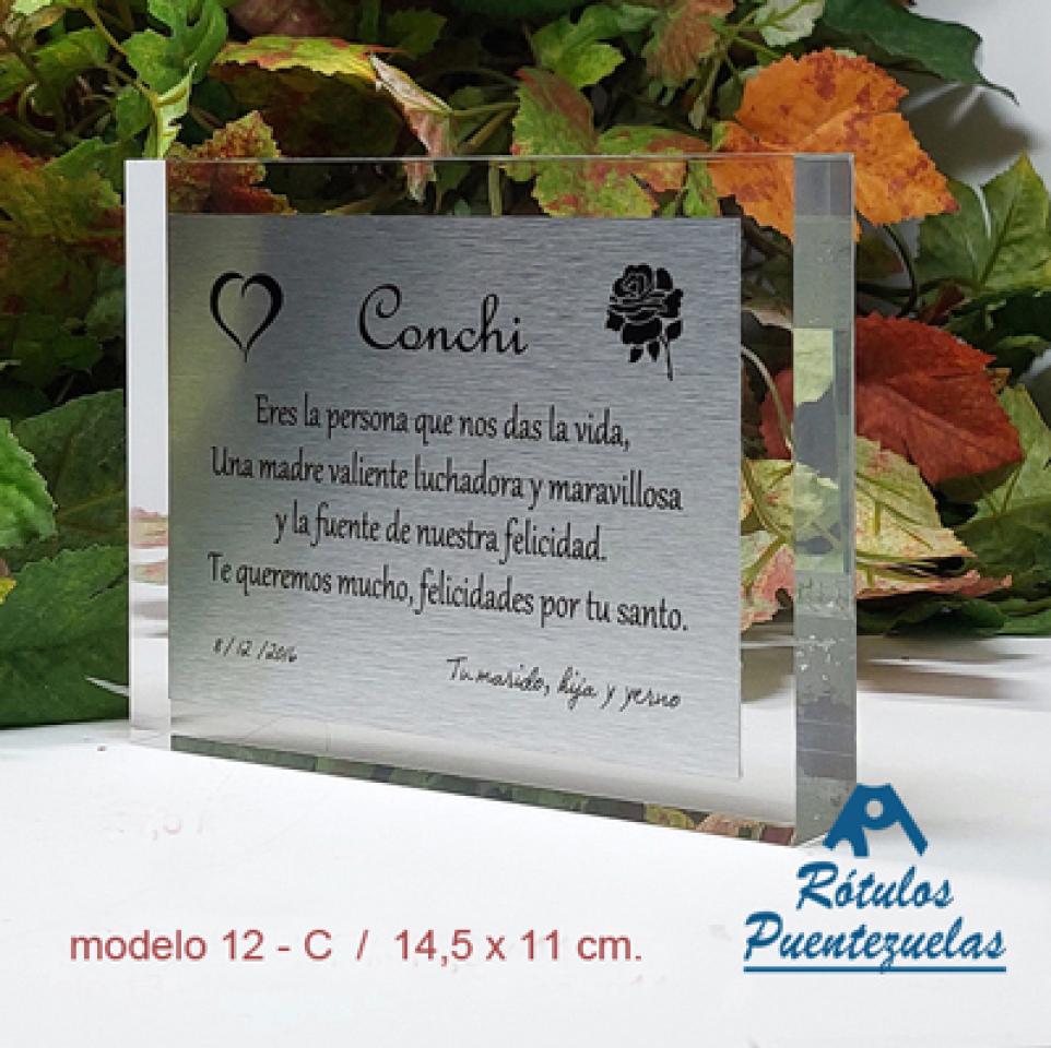 Placa de homenaje de sobremesa IMPRESA en ALUMINIO plateado cepillado satinado (mate), placa de forma recta y textos en negro o en color según el diseño, se incluye en el precio expuesto la IMPRESIÓN convenida, y el ESTUCHE ESTÁNDAR de presentación.