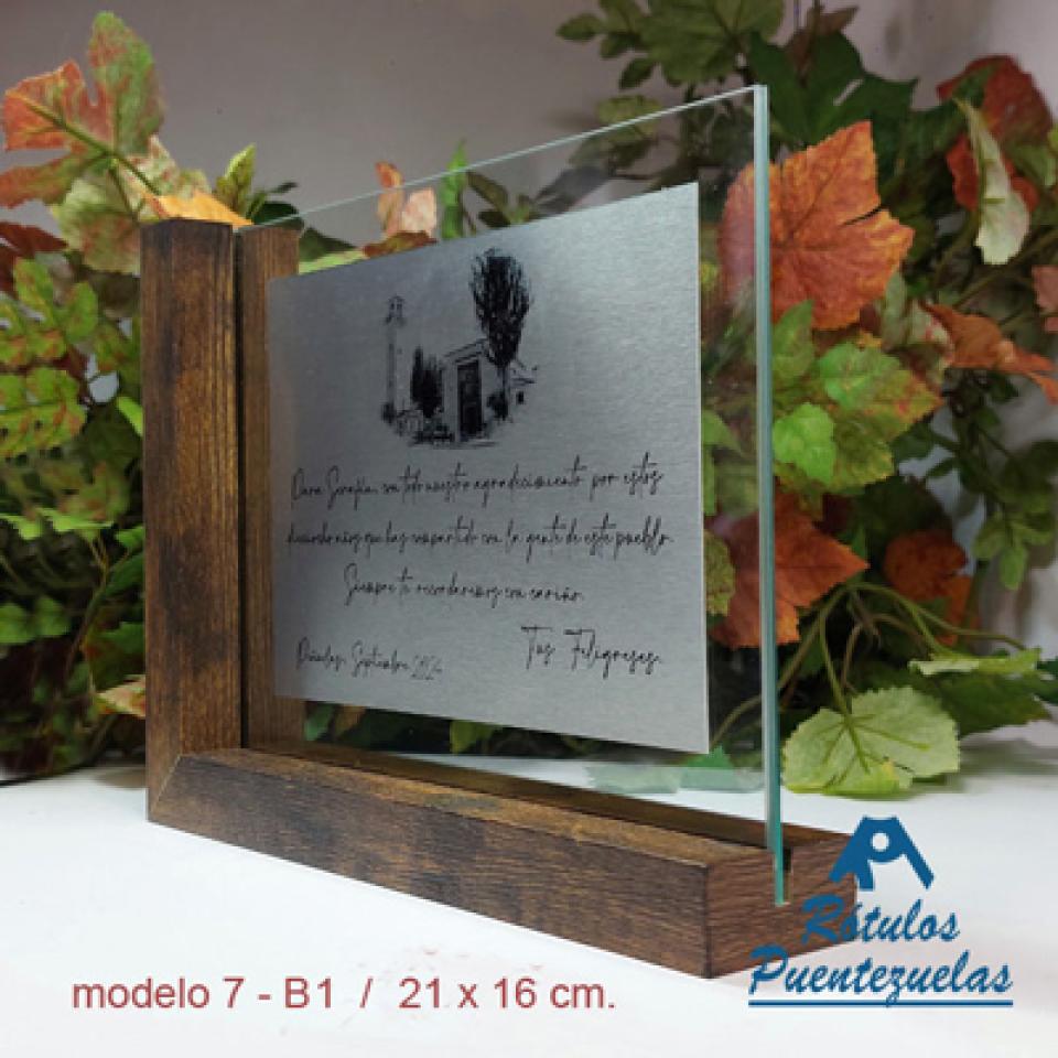 Placa de homenaje de sobremesa IMPRESA en ALUMINIO plateado satinado (mate), placa de forma recta y texto impreso en negro según el diseño, la placa de aluminio se sitúa entre dos metacrilatos, se incluye en el precio expuesto la impresión convenida y CAJA DE EMBALEJE.