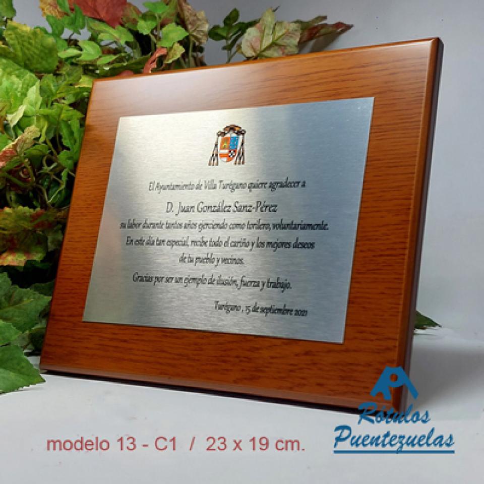 Placa de homenaje de sobremesa IMPRESA en ALUMINIO dorado cepillado satinado (mate), placa de forma recta y textos en negro o color según el diseño, se incluye en el precio expuesto la IMPRESIÓN convenida y el ESTUCHE ESTÁNDAR de presentación.